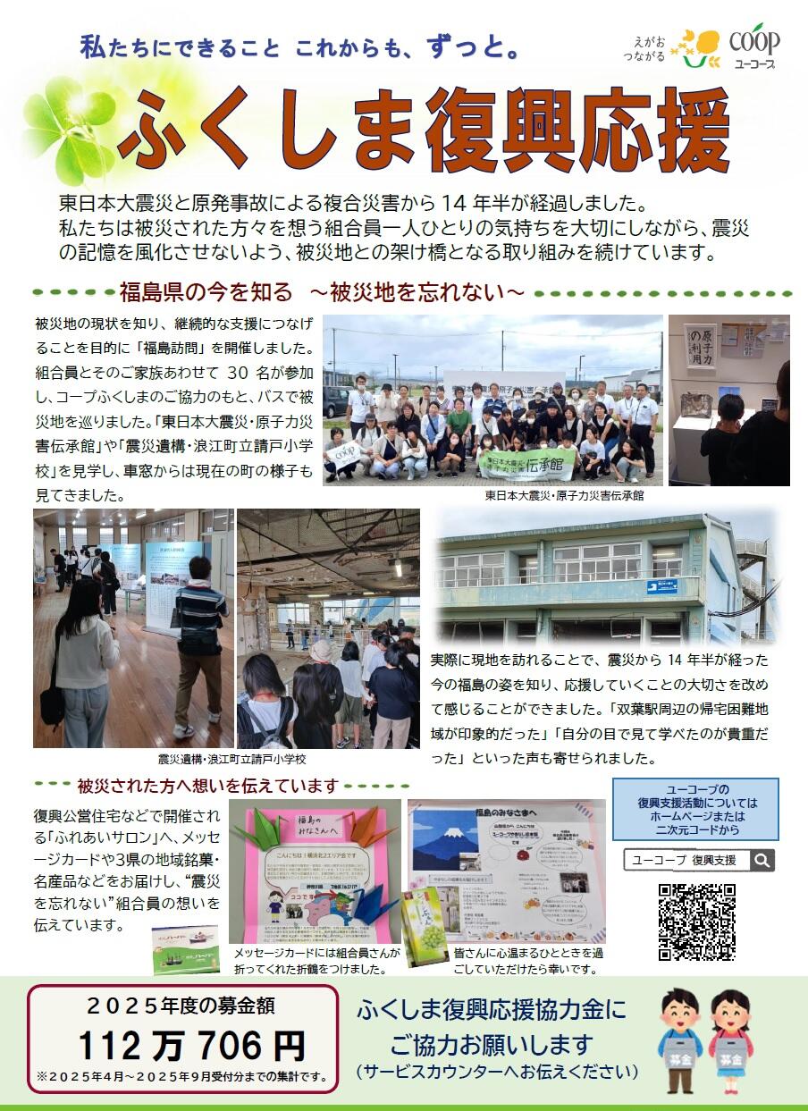 ユーコープは「震災を忘れないこと」「支援を続けること」を大切に、被災した方々に思いを寄せて、復興応援の取り組みを続けています。2025年9月、現地を訪れることで被災地の現状を知り継続した支援につなげる、福島を忘れないことを目的に、昨年に引き続いて3県合同で「福島訪問」を開催しました。