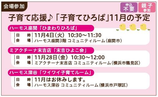 ★ハーモス深谷(横浜市戸塚区) 「ワイワイ子育てルーム」※ブログはこちらから★ミアクチーナ末吉店(横浜市鶴見区)「末吉ひよこ会」★ハーモス座間(座間市) 「ひまわりひろば」