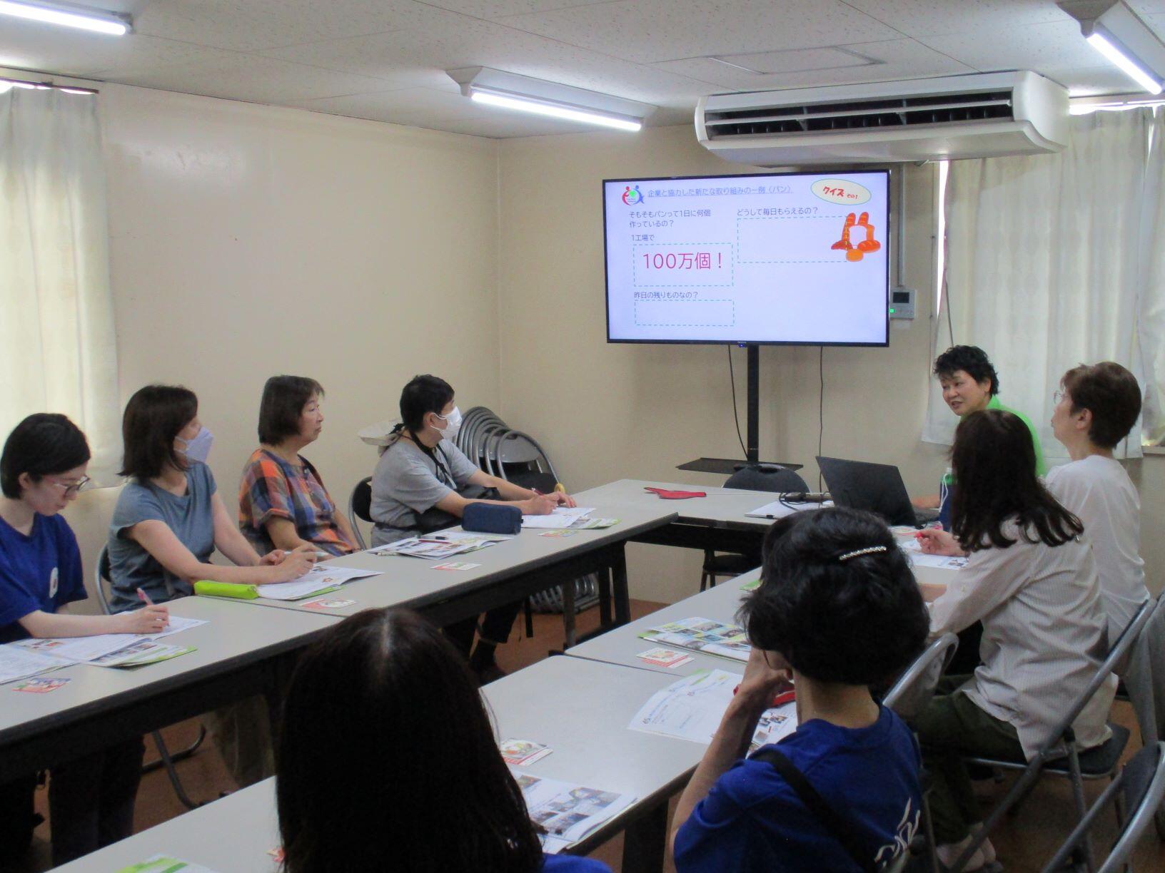 はじめに事務局の三枝さんから、フードバンクかながわの成り立ち、役割、そして今問題になっている食品ロスや貧困についてのお話をしていただきました。クイズを交えながらのお話はとても分かりやすく、みなさん熱心に耳を傾けていました。