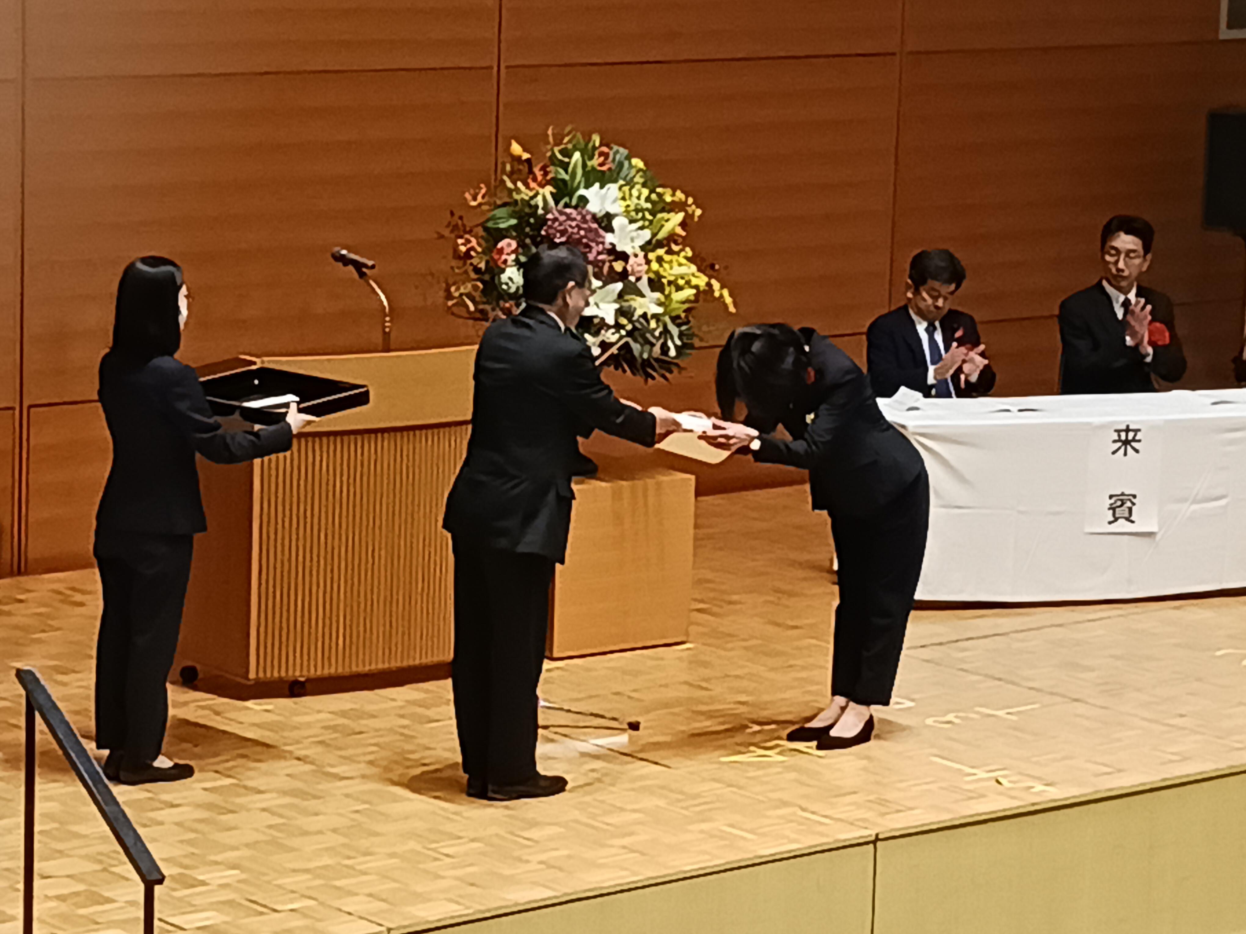 授賞式がおこなわれた、令和7年度静岡県健康福祉大会当日、ユーコープを代表して勝又かおり組合員理事が出席し、塚本秀綱静岡県副知事より知事褒章が授与されました。この受賞は、長年にわたるユーコープの赤い羽根共同募金に対する組合員の皆さまのあたたかい支援により受けることができました。