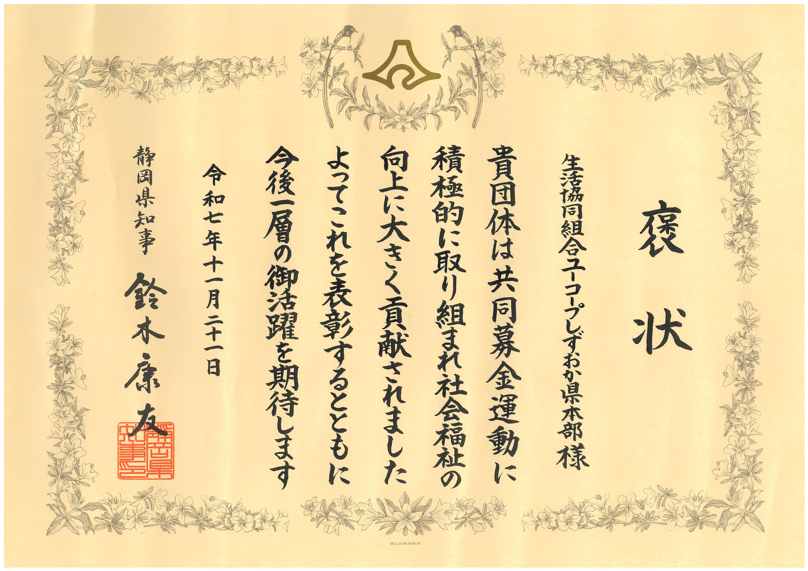ユーコープが静岡県内でおうちCO-OPや店舗ご利用の皆さまへ「赤い羽根共同募金」を長年にわたり呼びかけ、顕著な功績を挙げた団体として「知事褒章 共同募金運動推進者」を受賞しました。