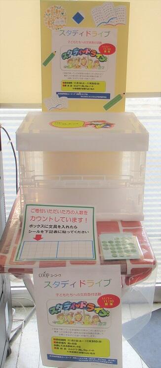 お店にご協力いただき、旭ヶ丘店では、回収ボックスを設置、萩園店ではサービスカウンタでの回収をお願いしました。旭ヶ丘店は3回目となり、集まる文具の数を心配しましたが、今年も回収ボックスに入りきらないほど集まりました。(シールアンケートによる参加者 20名)