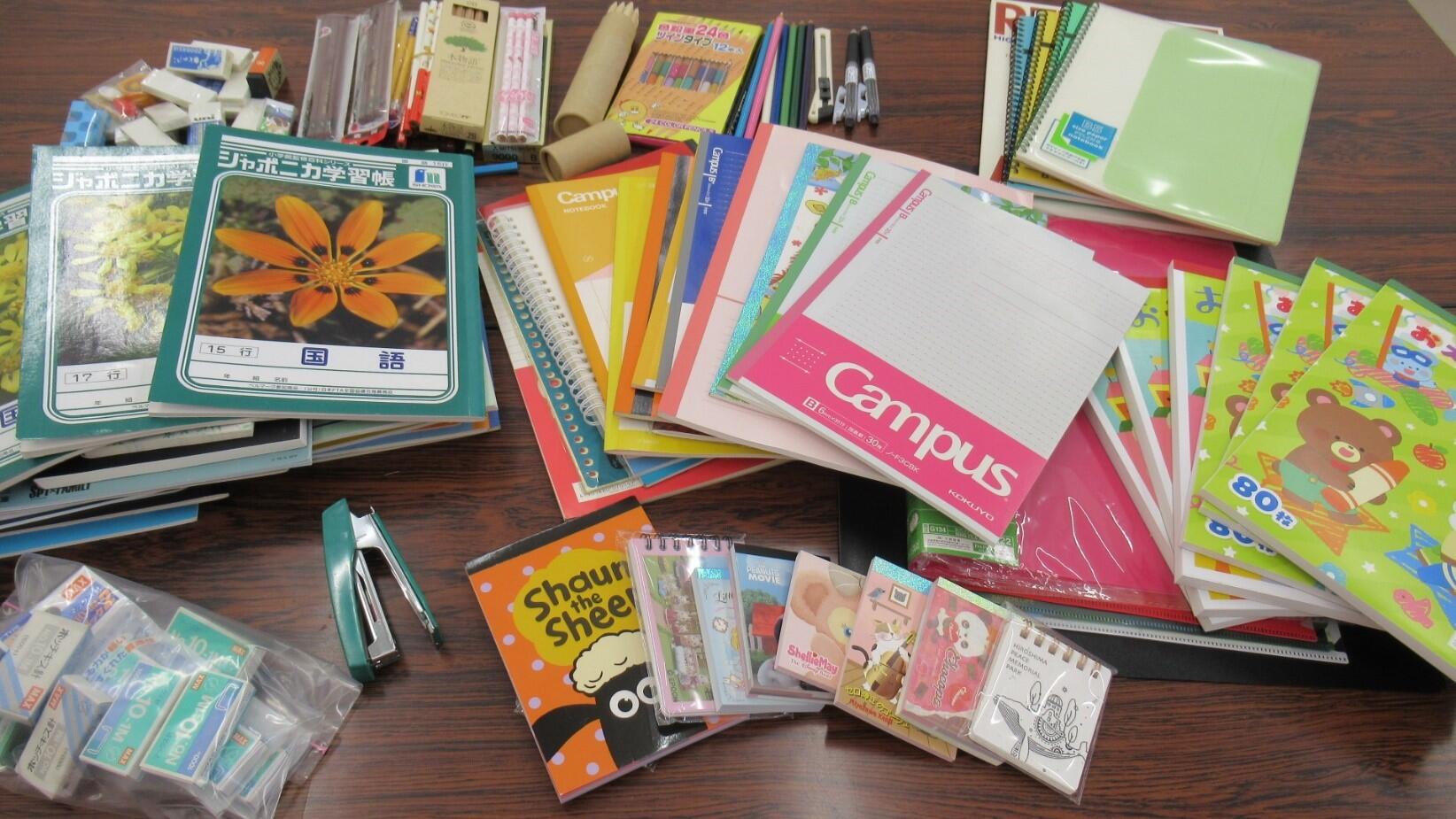 ノートや鉛筆など、今年もたくさんの文房具を寄付していただきました。