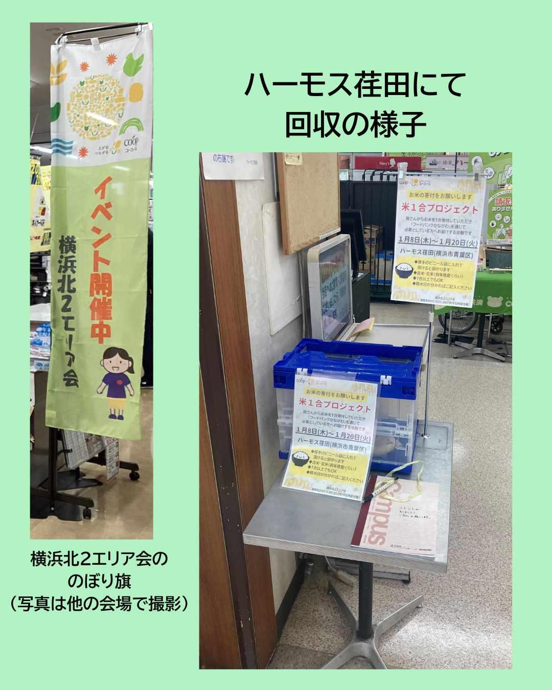 横浜北2エリア会では、1月8日~1月20日までハーモス荏田(横浜市青葉区)で「米一合プロジェクト」を開催しました。
