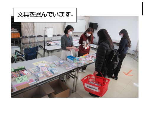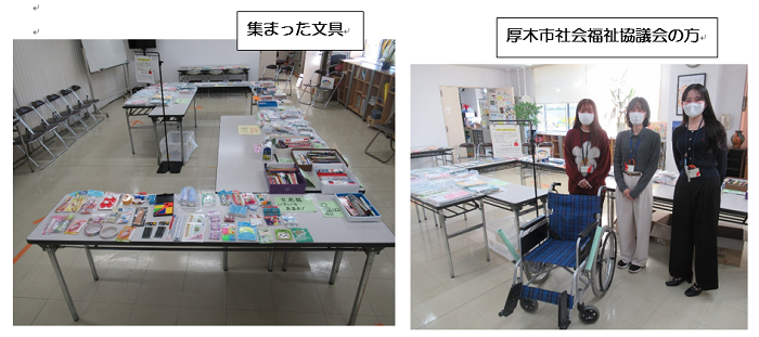 回収した文具は11/26(水)に厚木戸室店コミュニティルームにて「お渡し会」を実施しました。当日は厚木市社会福祉協議会より紹介された7組の支援団体、(11名)の参加がありました。受け取りに来られた方々は楽しそうに文具を選んでいました。