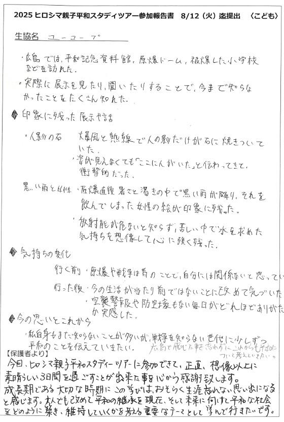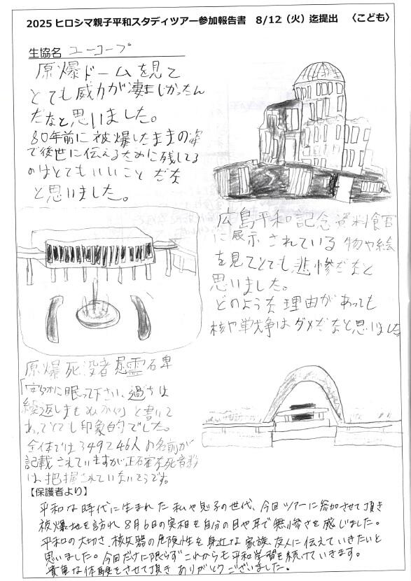 被爆・戦後80年となる今年も平和を願うすべての人々と手をつなぎ、戦争も核兵器もない平和な社会の実現を願い、8月5日(火)~8月7日(木)の3日間、県内の生協と共同で「ヒロシマ親子平和スタディツアー」に取り組みました。ユーコープからは4組8名の組合員が参加しました。資料館や碑めぐりの見学など、ヒロシマでしか得ることができない貴重な体験を心に刻むことができました。