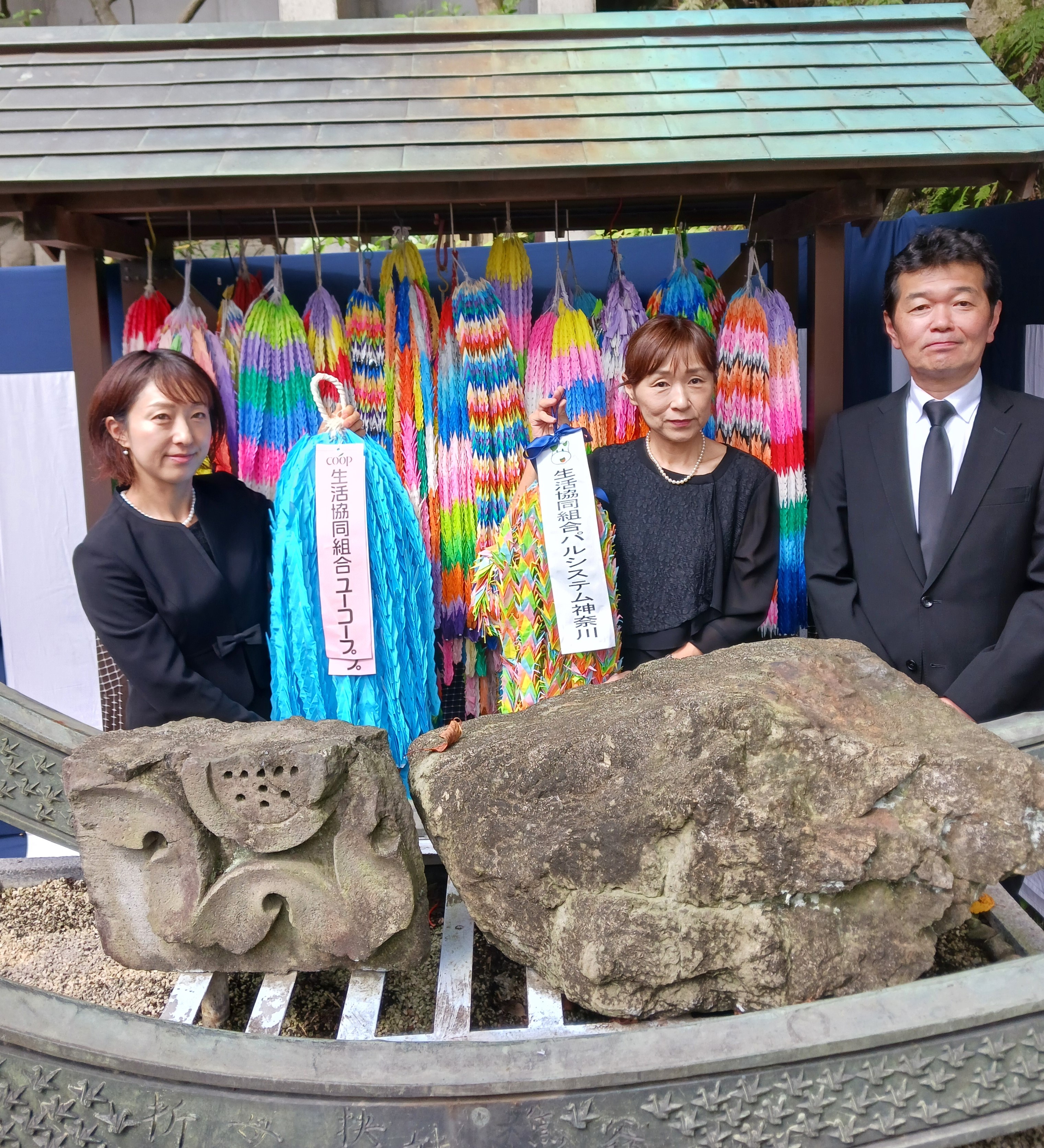 ユーコープからは、組合員の皆さんにご協力いただき作製した平和の願いを込めた折り鶴千羽を奉納しました。