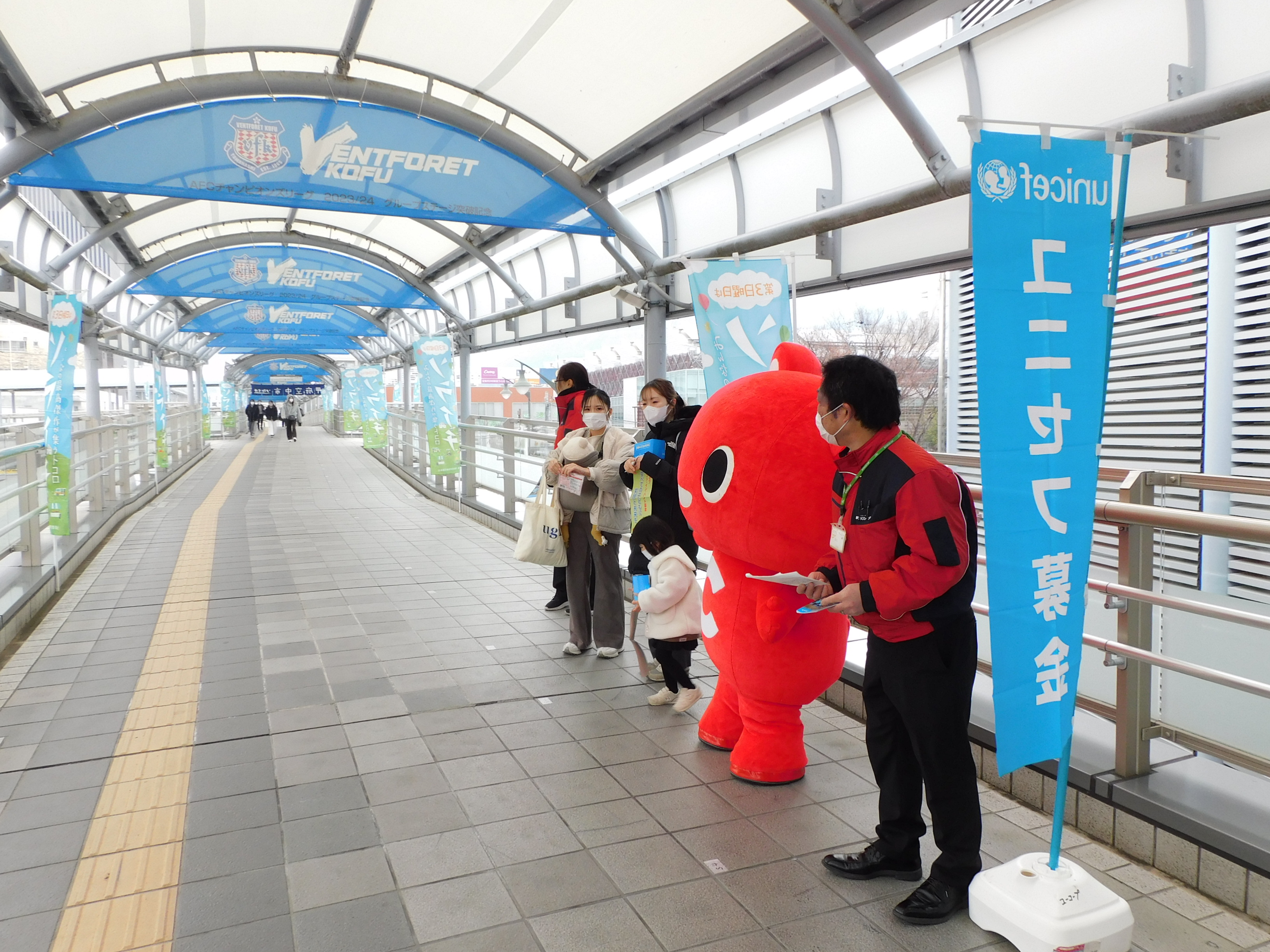 「コーすけ」も登場し、こども達をはじめ駅を行き交う多くの方々の注目を集めながら、リーフレットを配布し、ユニセフ支援の輪を広げることができました。