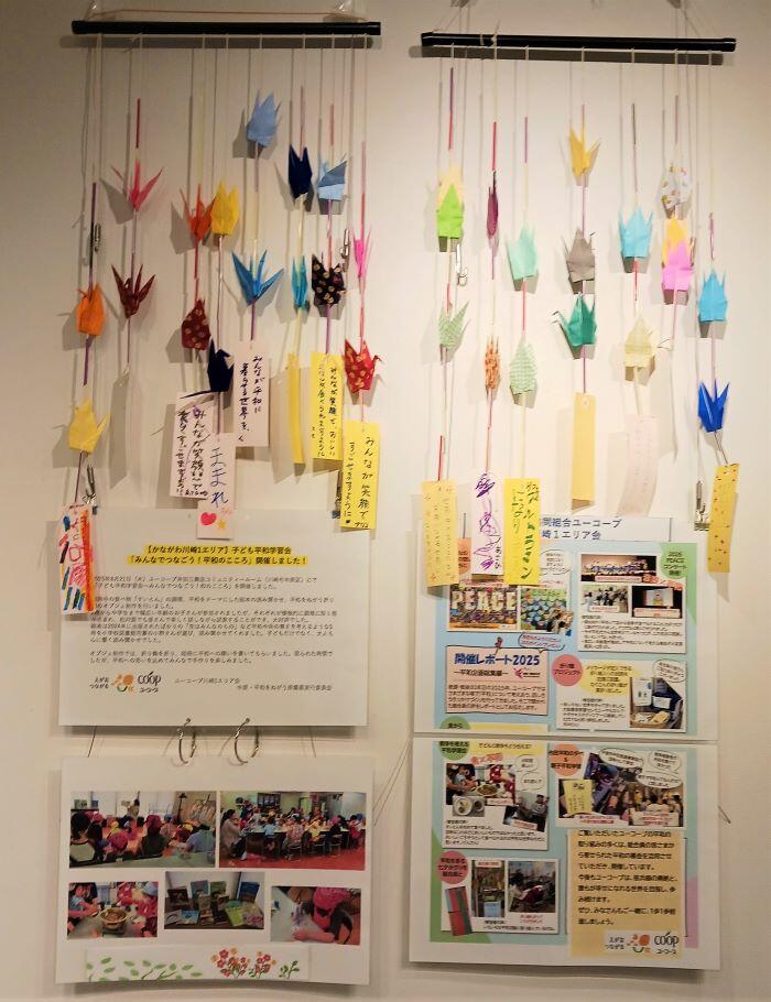 会場には、川崎1エリア会が夏休みに開催した「子ども平和学習会~みんなでつなごう!平和のこころ~」に参加いただいた皆さんが作成した色鮮やかな折り鶴と平和へのメッセージをオブジェにして展示し、多くの方が足を止めてくださいました。
