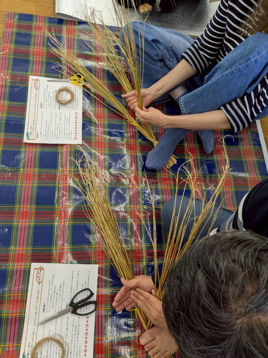 講師の先生を囲んでの交流会では、藁のこと、しめ飾りのこと、水引についても教えていただきました。とてもためになるお話をありがとうございました。それから、藁の束を希望者にプレゼントしてくださいました。