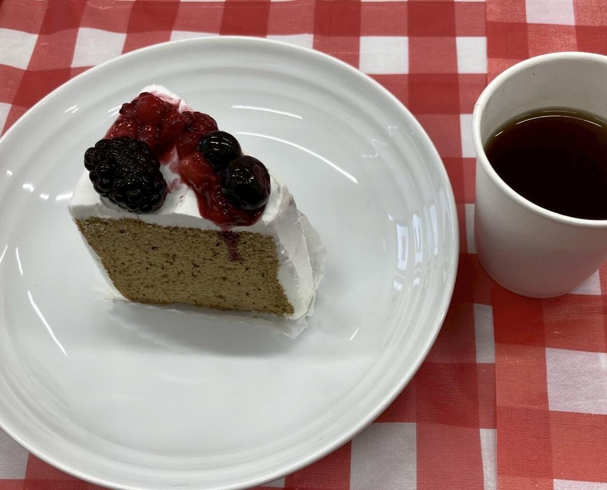 CO・OPクオリティの冷凍ケーキから紅茶のシフォンケーキに、CO・OP4種のベリーミックスを使って簡単につくったベリーソースを添えて、プチカフェ気分♪