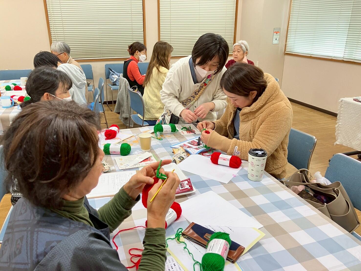 編み物経験者の方が、隣の初心者さんに「ここはこうするといいですよ」と声をかける場面もあり、編み物をきっかけに、あちこちで会話の花が咲いていました。