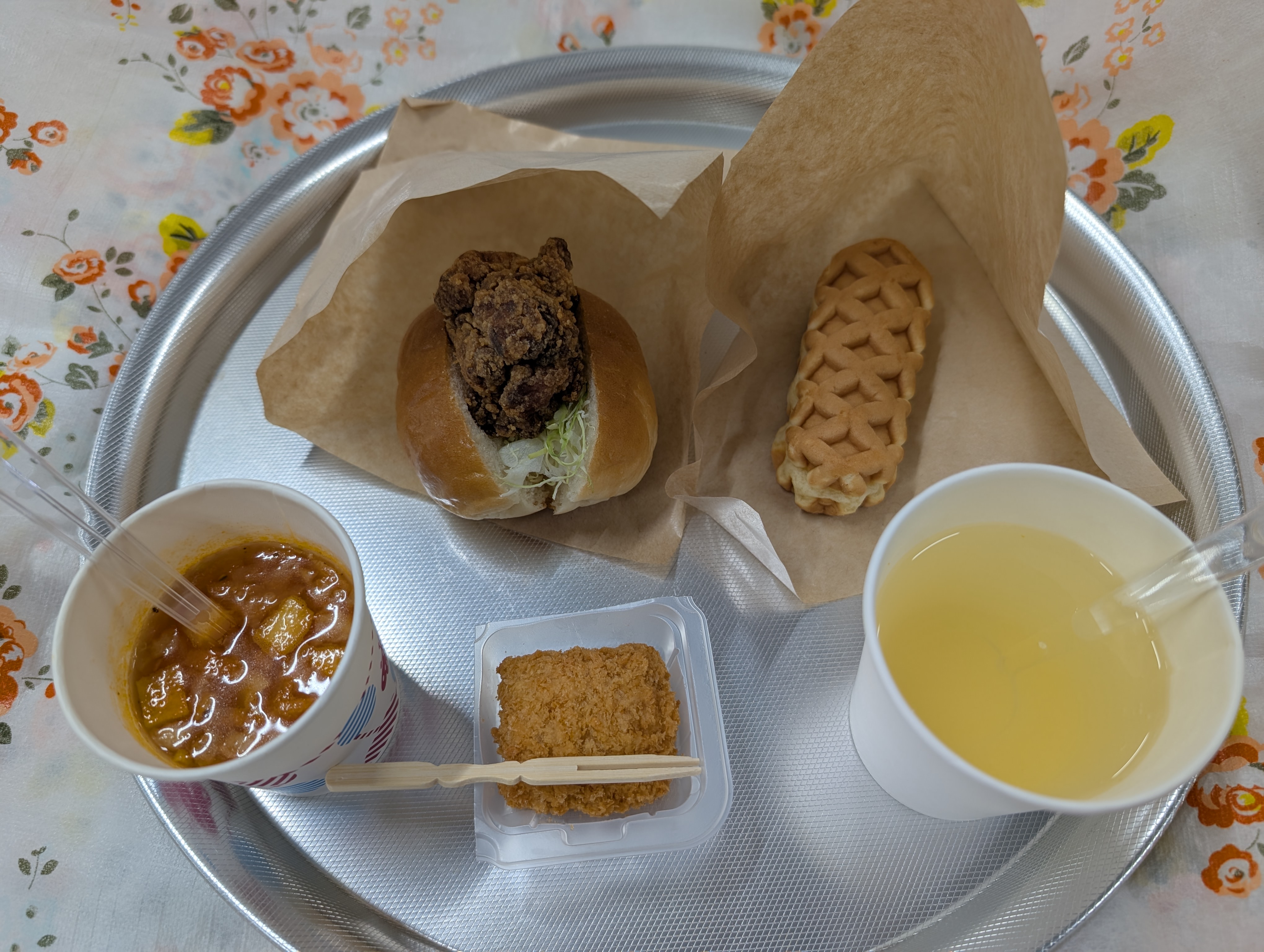 試食コーナーは、ザンギバーガー、ミニワッフルドック(チーズ)、4種野菜とミネストローネ、白身魚とタルタルソースフライをご用意しました。
