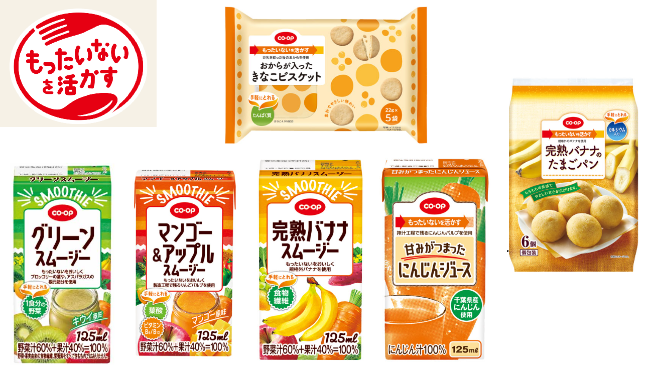 また、「もったいないを活かす」取り組みを紹介し、3種類のスムージー、にんじんジュース、完熟バナナのたまごパン、