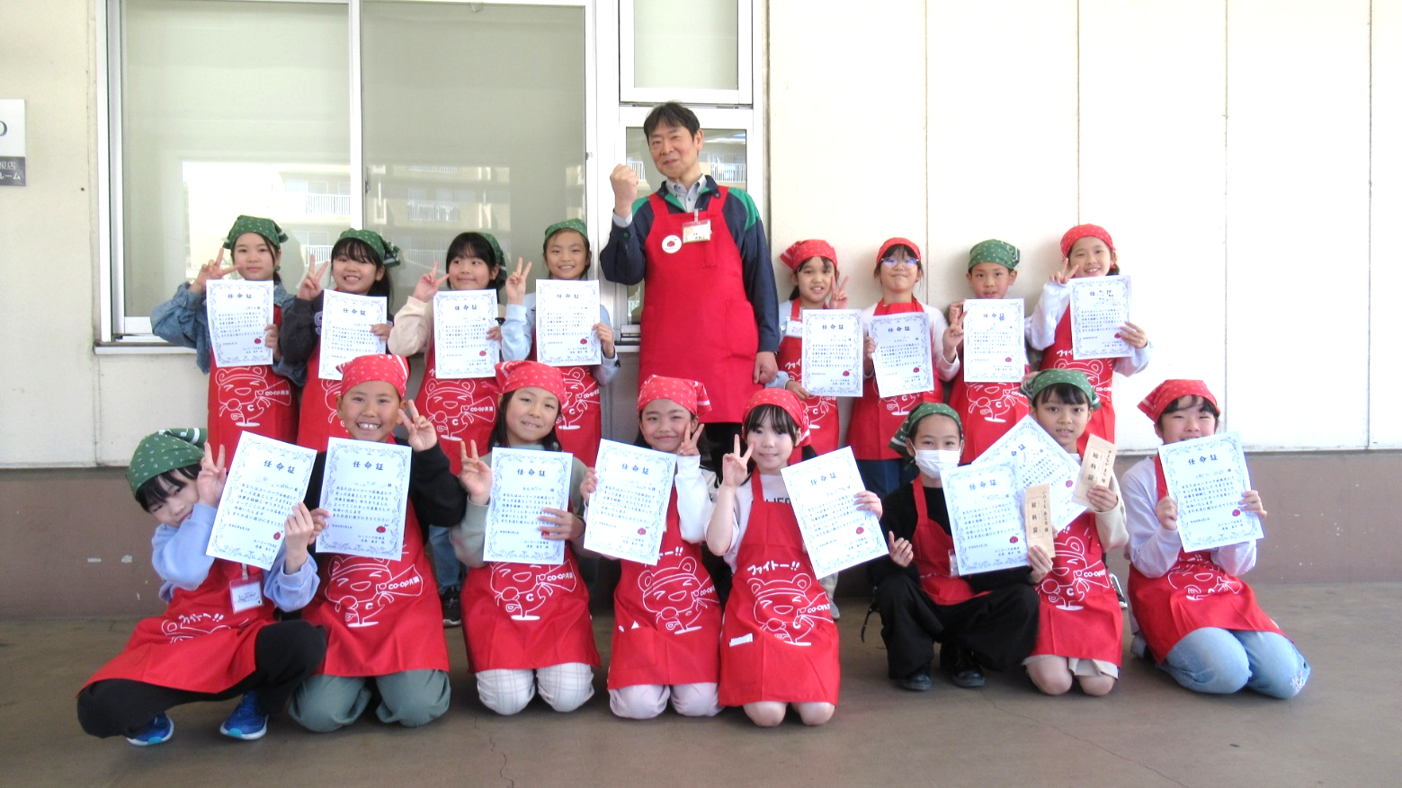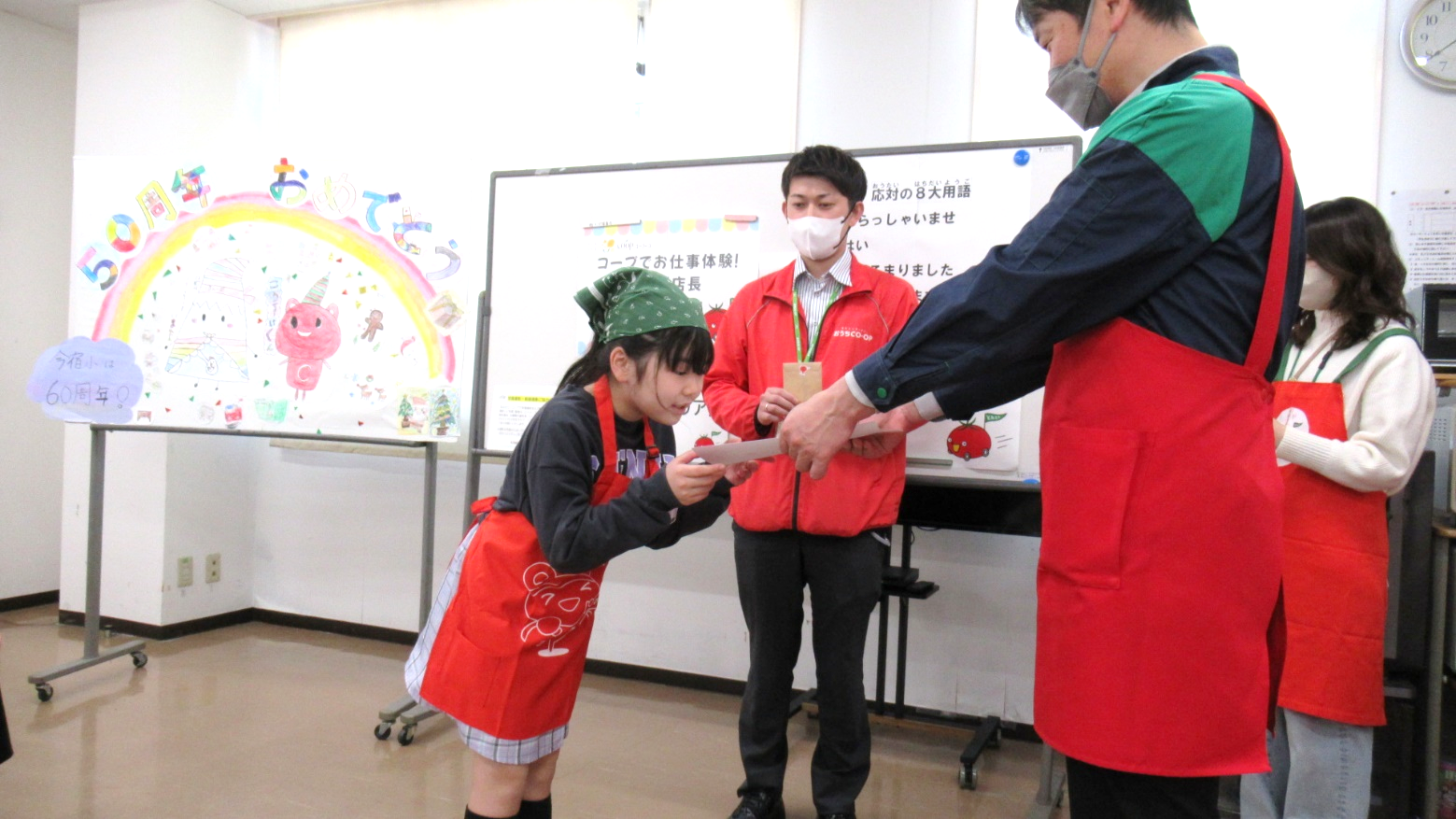 修了式では店長から「キッズ店長任命証」と「お給料」を渡し、最後の交流会では店長もスタッフもみんな一緒にコープ商品を試食しながらおしゃべりを楽しみました。「大人になったらコープで働きたい!」とうれしい声もきかれました。今日の体験を通してお店をより身近に感じてもらえたのではないかと思います。