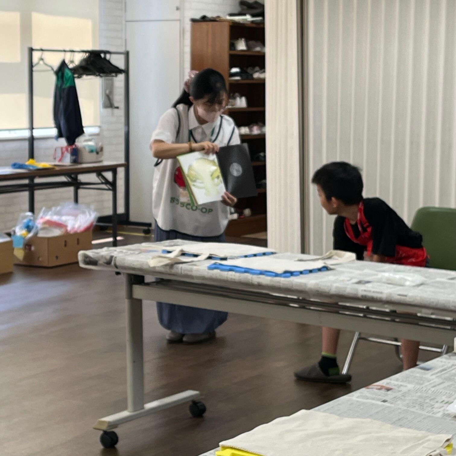 後半は、親子で工作の時間です。絵本で野菜の形や断面などを見たあとは、野菜のスタンプで世界にひとつのオリジナルエコバッグを作りました!