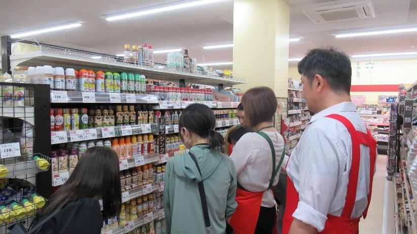 シールアンケートをしたことで試食したいものが一目でわかり、参加者同士の好みもわかってきました。その後店長と店舗へ行き、ドレッシング売り場を見学し購入しました。参加者が3名だったこともあり、試食してみたいドレッシングをその場でひとり1本選んでもらいました。
