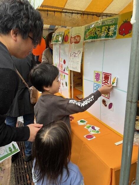 「知ってる?旬の野菜」と題し、ホワイトボードを春夏秋冬に分け、いろいろな野菜マグネットを該当する季節に貼ってもらうクイズを実施し、223名の親子に参加していただきました。