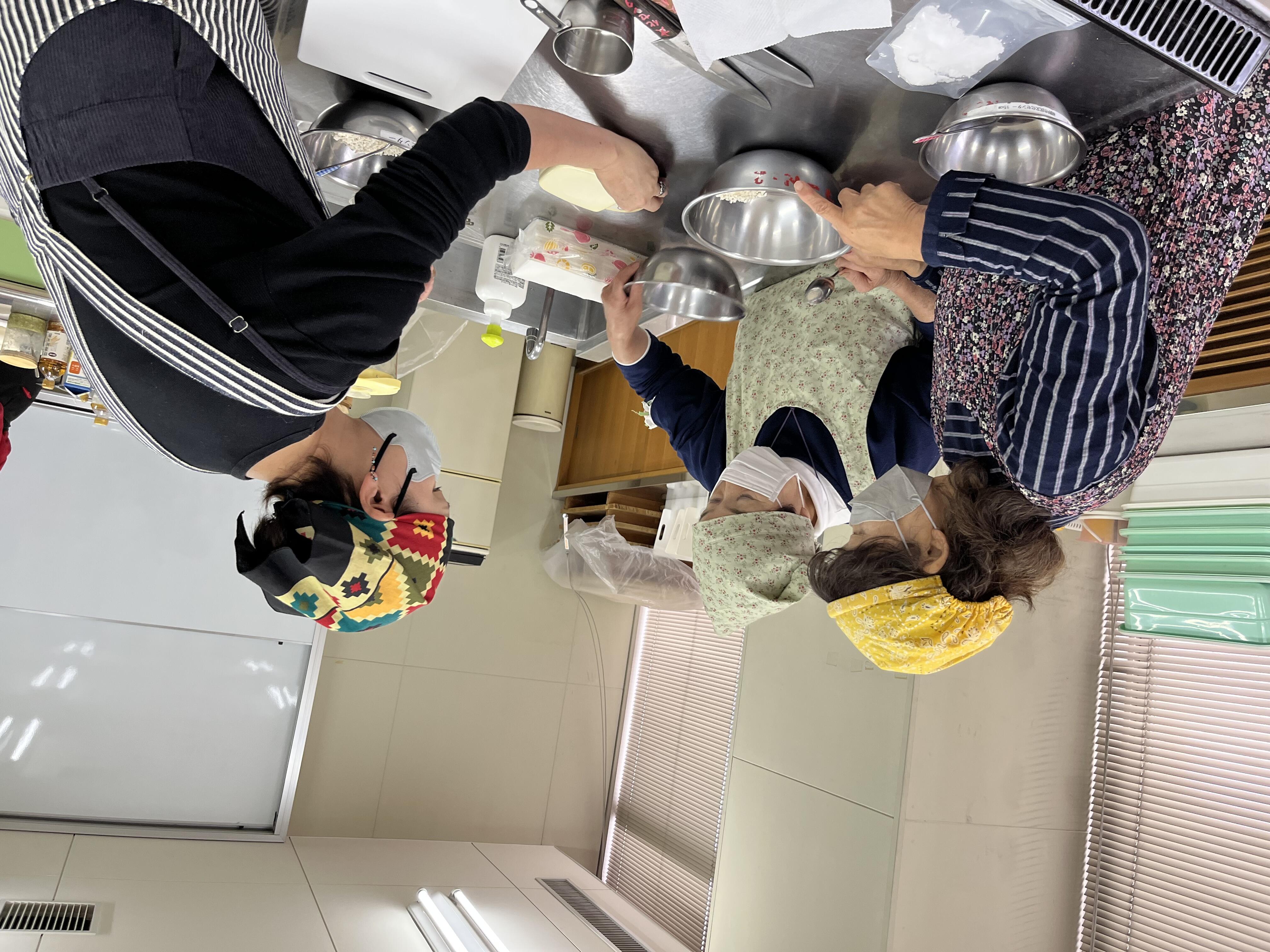 実際に玉ねぎ麹の作成です。「うまく量れる?」「あら、こっちは少ないわよ」