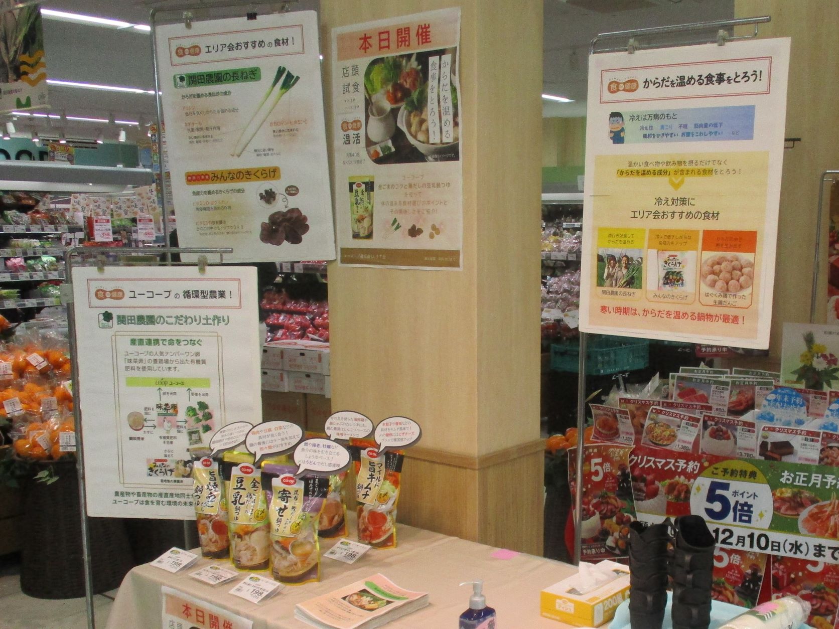 展示したパネルで、栄養面だけでなく商品になるまでのこだわりや、ユーコープの循環型農業への取り組みをお伝えし、ユーコープの鍋つゆ全5種を展示して案内しました。