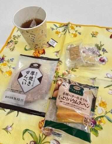コープクオリティシリーズの、こだわりおかき(しょうゆ・しお)・香ばしアーモンドの厚焼きせんべい・発酵バター仕立てのしっとりバウムクーヘンと、三角ティーバッグ紅茶で楽しく交流しました。