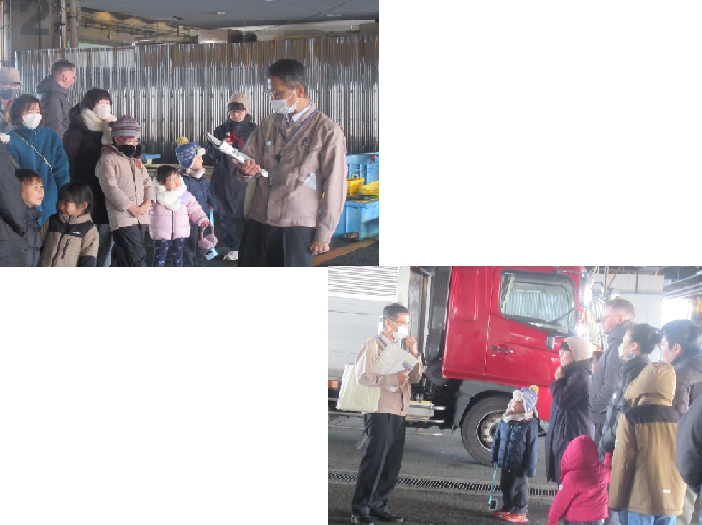 漁港見学では真剣に話を聞く様子が見られました。途中でフォークリフトなどが動いていて、