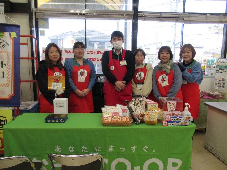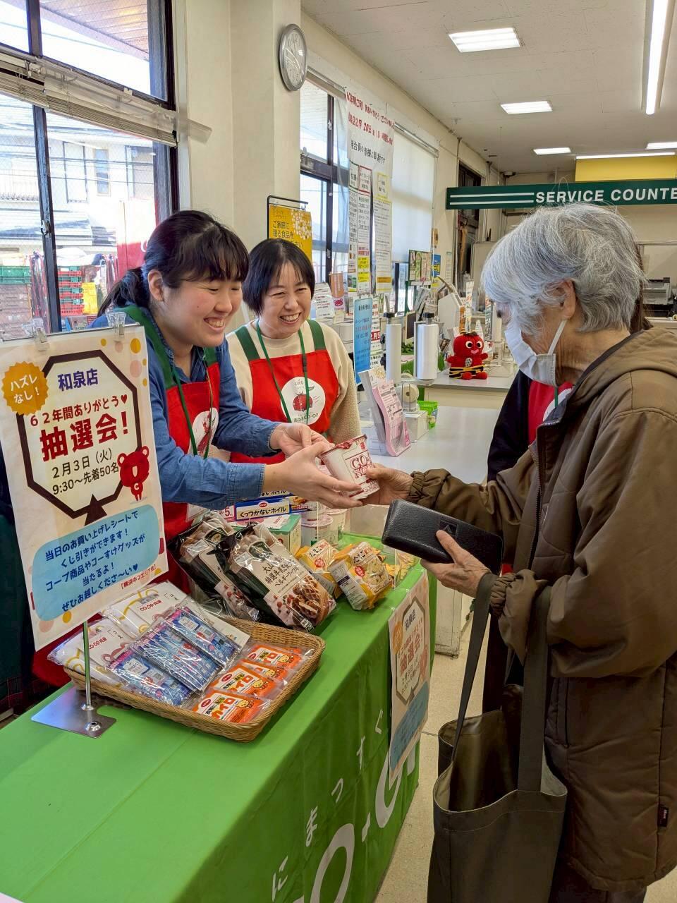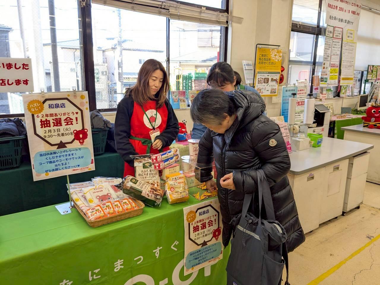 当日、お買い物をしていただいた方に、エリア会がおすすめするCO-OP商品や、コーすけグッズが当たるくじをひいていただきました。