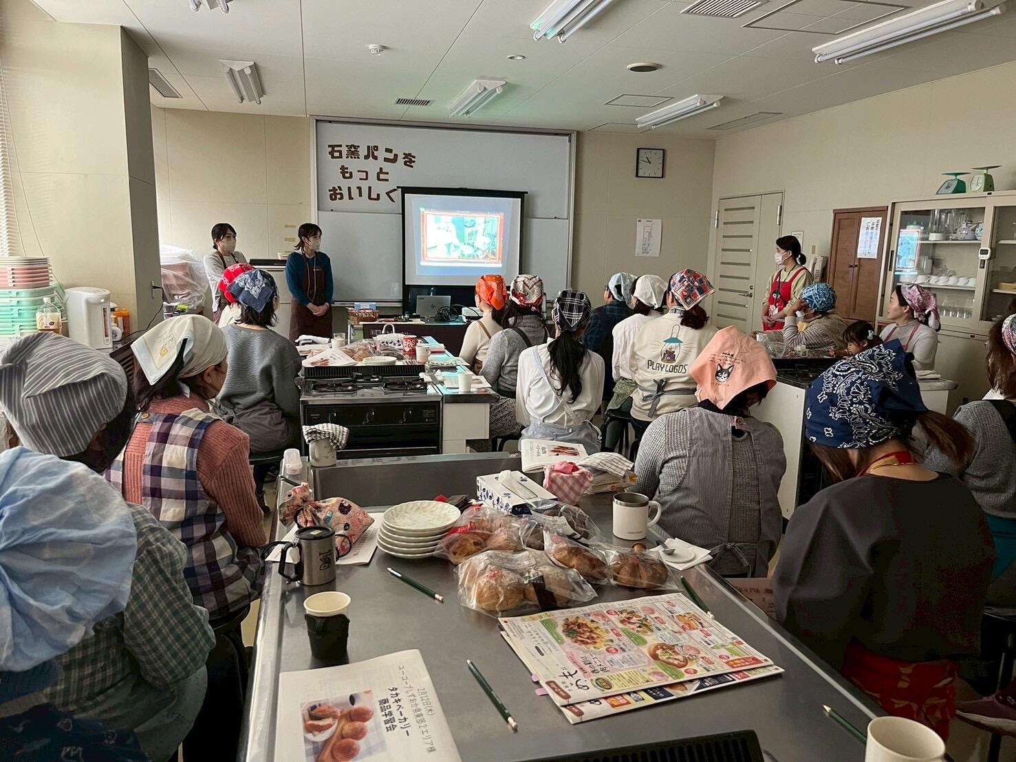 企画の前半は、タカキベーカリーさんがご用意してくださったDVDの上映とスタッフの方による説明が行われました。(株)タカキベーカリーのこれまでの歩みや企業理念、石窯パンへのこだわり、焼成冷凍パンの美味しい焼き方や保存方法、さらに人気商品のひとつであるくるみパンの開発ストーリーなどについて教えていただきました。