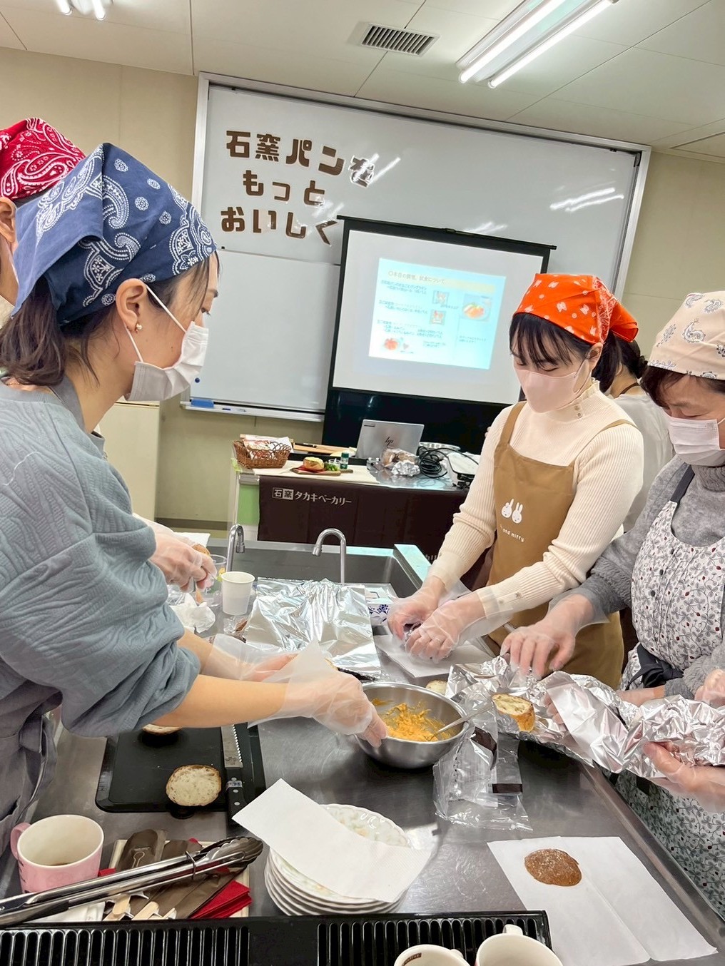 講習のあとにタカキベーカリーさんからアレンジレシピの紹介があり、その説明を受けたあとで参加者の皆さまが調理にとりかかりました。今回作ったのは、『石窯パンのまるごとパングラタン』です。
