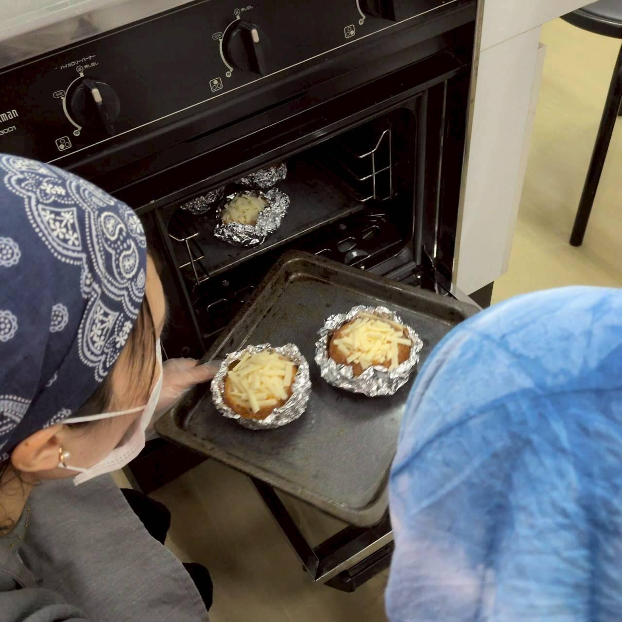 石窯ライ麦ロールの袋を開けるといい香りが会場に広がりました。調理は皆さま手際よく分担しながら進みました。オーブンに入れると、チーズのとけ具合を見ながら「そろそろかしら?」「美味しそうな香りがしてきたわ」という声があがり、完成を心待ちにする様子がとても印象的でした。