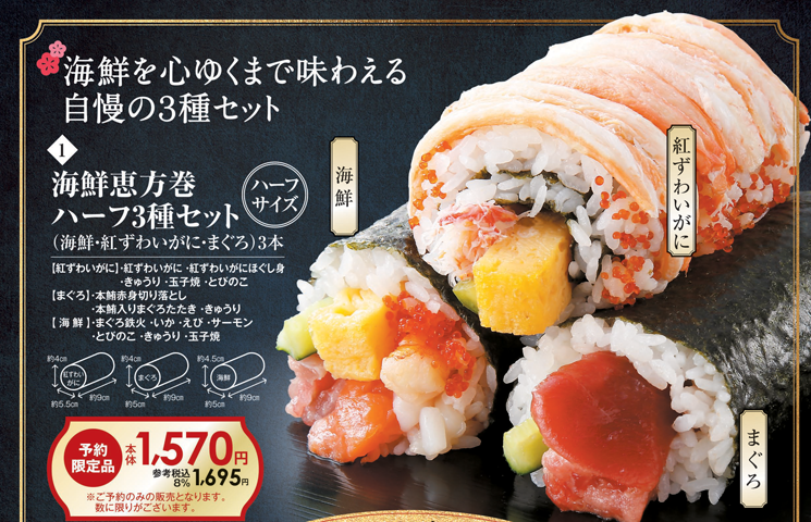 ◎海鮮恵方巻ハーフ3種セット(海鮮・紅ずわいがに・まぐろ)