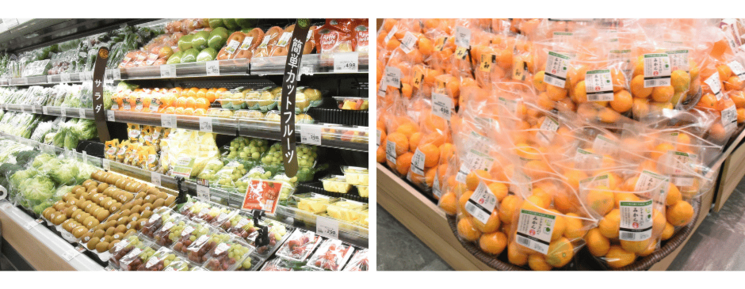 青果コーナーは「ユーコープ産直商品」がおすすめ。「コープの産直」マークが目印です!他にも季節ごとの旬の野菜や果物を取りそろえています。