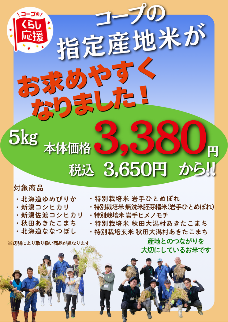 おうちCO-OPおよびユーコープのお店では、コープの指定産地米5㎏を 本体価格3,380円(税込3,650円)からご提供しています。