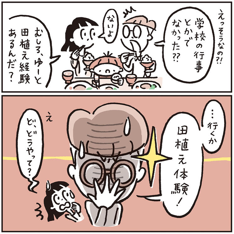組合員の田植え体験。田んぼに足をとられ、最初は緊張していた参加者も、終えるころにはすっかり打ち解け、生産者の方々と笑顔でお話する姿も見られます。