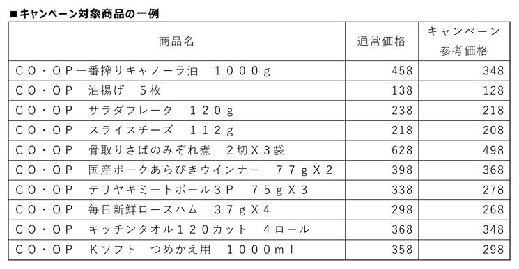 「くらし応援全国キャンペーン」は、物価上昇が続く状況の中、宅配での注文や店舗での購入に対する組合員のくらしを応援するため、くらしに身近な商品を選定し、全国各地の生協にて特別価格で提供します。