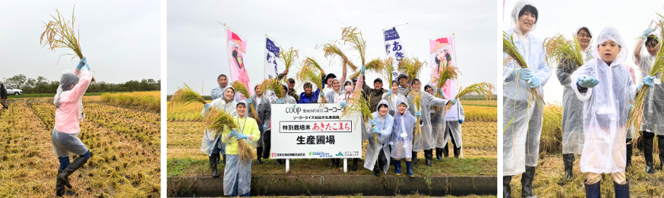生活協同組合ユーコープ(以下:ユーコープ)は、2025年9月20日(土)・9月21日(日)秋田県南秋田郡大潟村でCO・OP特別栽培米「秋田大潟村あきたこまち」の稲刈り産地交流を開催し、組合員親子5組10名が参加しました。生産者だけではなく、お米に関わるさまざまな方と組合員が直接交流をすることで、組合員は産地の理解を深め、CO・OP特別栽培米「秋田大潟村あきたこまち」の魅力やお米について深く考えることができました。また、生産者にとっても組合員との会話がお米づくりのモチベーション向上につながりました。