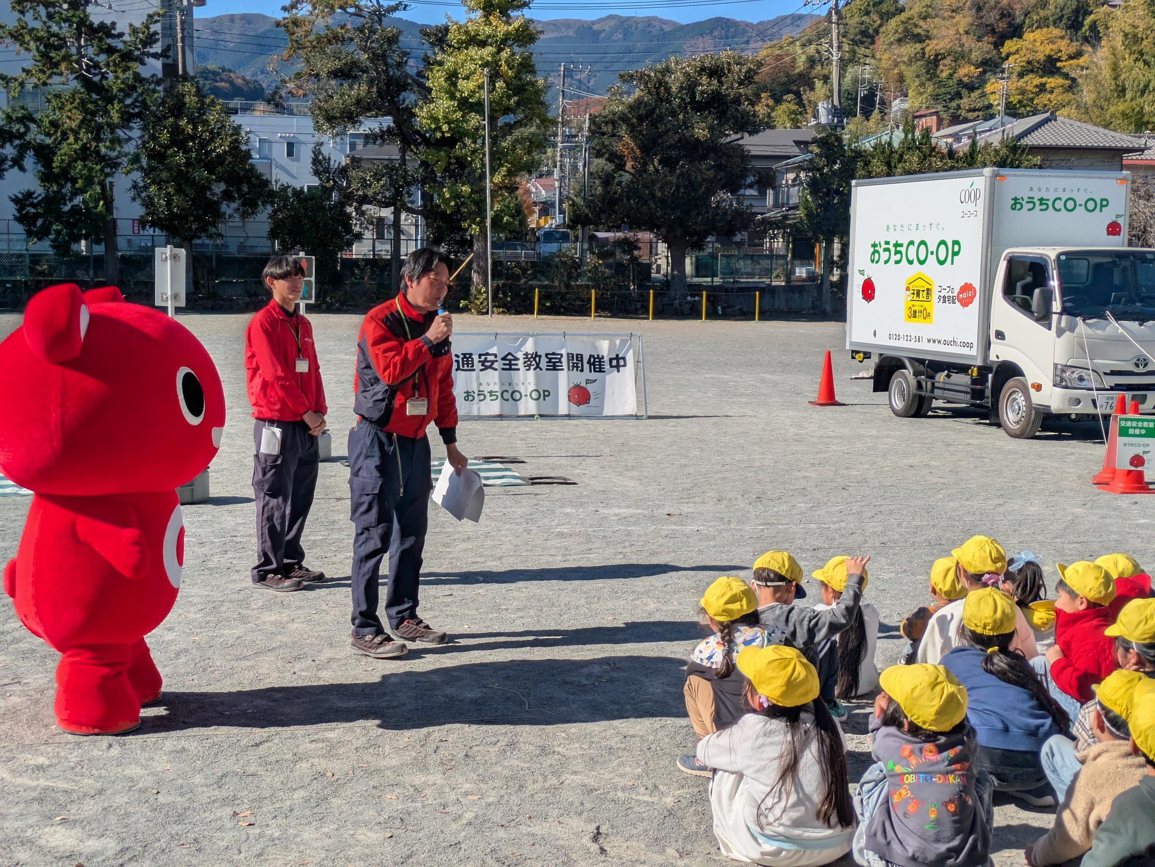 小学校にあがり、行動範囲が広がる7歳児は、大人よりも目線が低く、まだ注意力が育まれていないために、歩行中の交通事故による死傷者数が突出して多いというデータがあります。 未来あるこどもたちを交通事故から守るため、こくみん共済coopでは、「7歳の交通安全プロジェクト」のひとつとして、マイカー共済の見積もり1件につき1本の横断旗を寄贈する取り組みを実施しています。ユーコープでは、こくみん共済coopのマイカー共済を日頃より推進していることから、合同で贈呈しました。さらに当日は、おうちCO-OP小田原センターの職員が1年生の児童を対象に、寄贈した横断旗とトラックを使用した交通安全教室を開催して、児童は横断歩道の渡り方を学習しました。