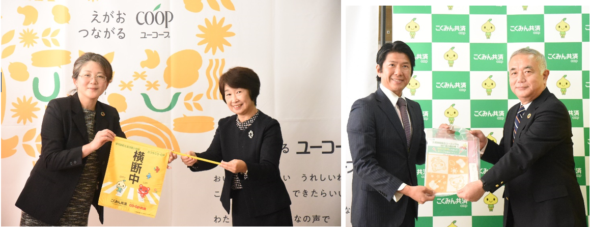 生活協同組合ユーコープ(本部:神奈川県横浜市、以下「ユーコープ」)は、11月26日(水)、こくみん共済coop関東統括本部と合同で、神奈川県にある湯河原町立湯河原小学校へ横断旗400本を寄贈しました。贈呈式では、両団体の代表から湯河原小学校 加藤 佳代校長、湯河原小学校 村瀬 公大PTA会長へ横断旗が手渡されました。